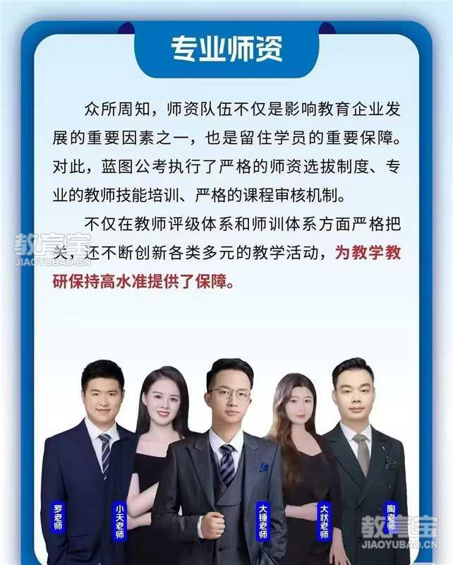 我们蓝图公考成立于2019年,总部在安徽合肥,蓝图公考拥有800多位全职公职培训类讲师,培训范围富含公务员国考培训、全国各省公务员培训、全国各地事业单位联考单招培训、三支一扶培训、军队文职培训、事业单位教师医疗培训等。蓝图公考一直致力于服务每一位学员,坚持好老师、好课程、好服务的教学理念,让每一位学员有所得、有所获、有所利,成立至今,线上线下服务学员数百万人次,深受学员好评。